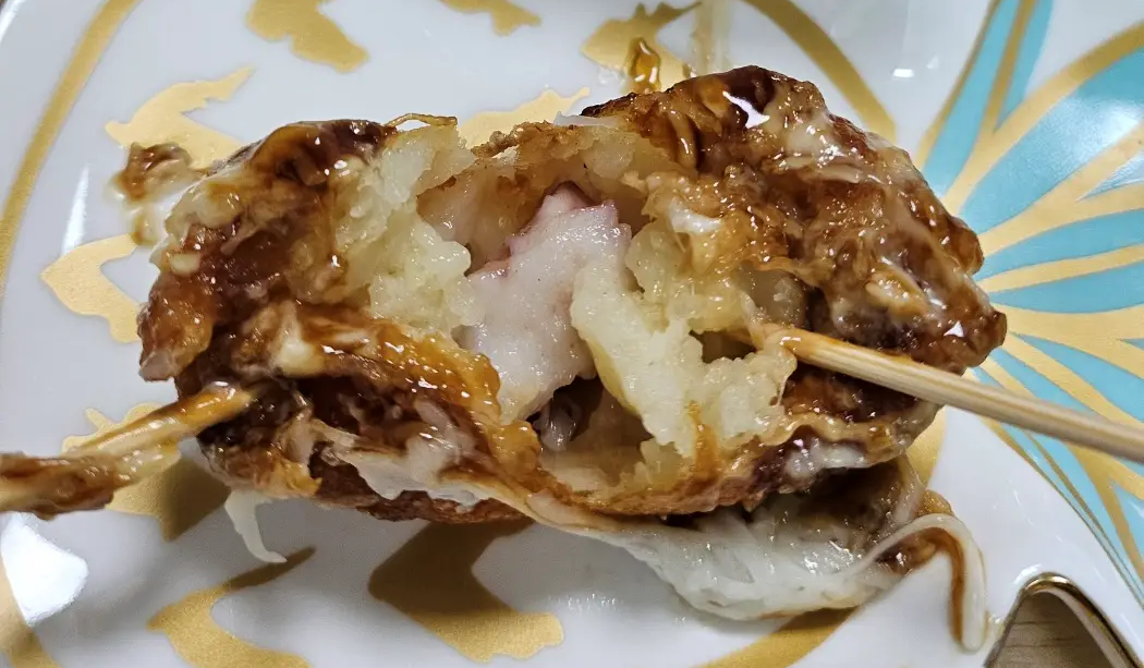 빵 오버쿡- 이븐하게 익지 않은 타코야끼. 푸석푸석하게 느껴져서 오래된 것을 재탕하나 싶을 정도이다. 겉바속촉의 타코야끼가 더욱 귀하게 느껴진다. 이런것들은 안이 스펀지화 되어있고 알이 작은 경우가 많다. 빠르게 구워진 공장식 타코야끼같다.