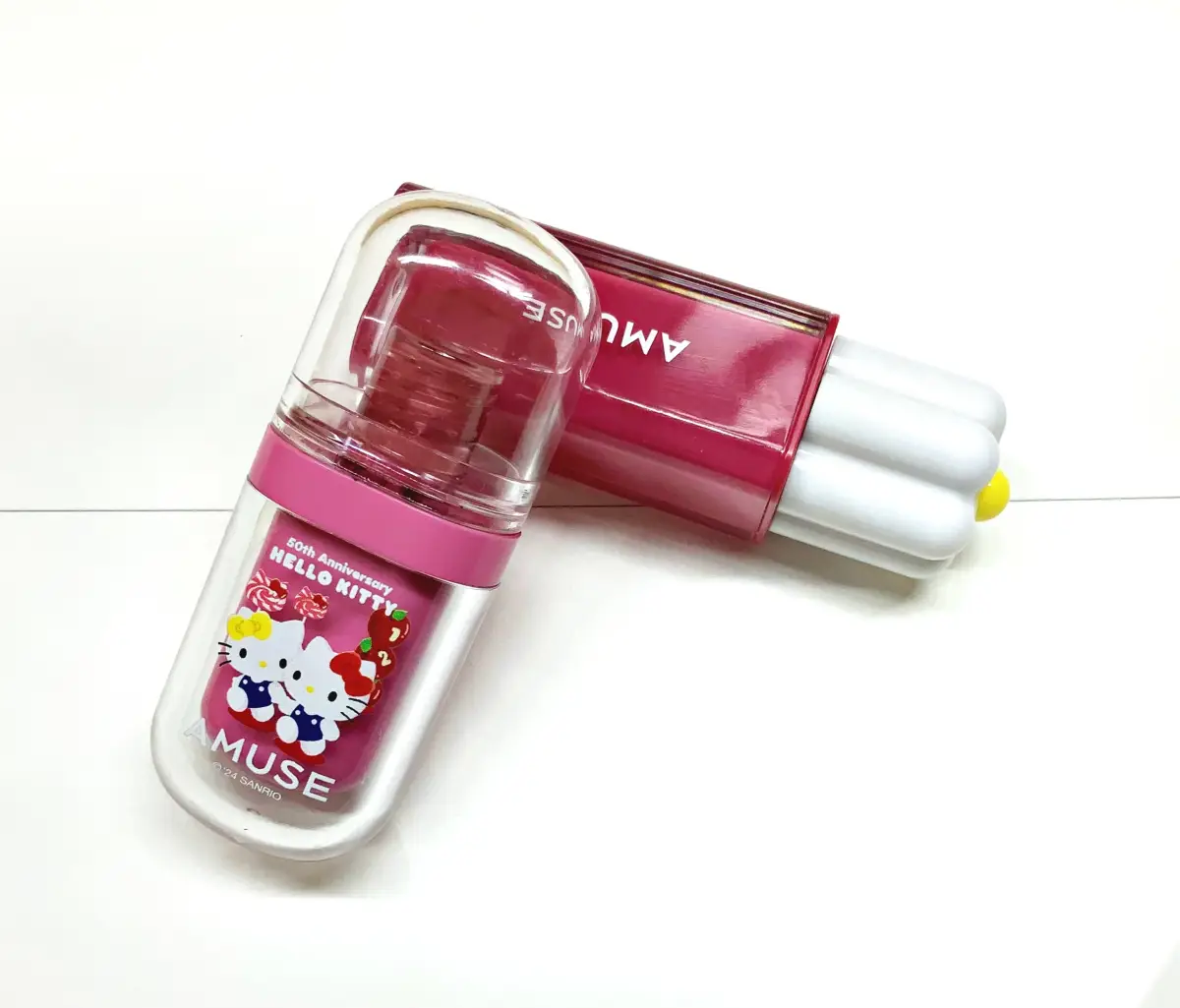 꽃뚜껑이 시선을 끄는 어뮤즈 듀틴트와 동글동글한케이스에 키티가 그려진 어뮤즈 젤핏틴트