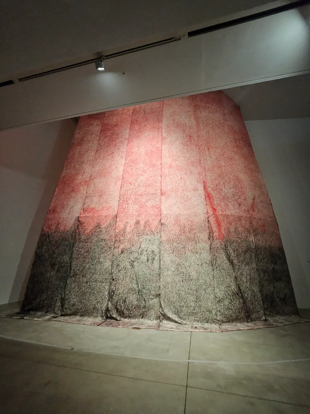 커튼을 열고 들어가자마자 시선이 가는 곳은 천장쪽에서 길게 내려오는 천들이었다. 붉은색, 검은색 칠해진 천들 옆에 모니터한대가 있었고 헤드셋이 놓여져 있었다. 모니터에는 아슬아슬하게 로프에 매달린 작가와 등반가들이 천위에 칠을 하고 있었고 헤드폰에서는 사각사각 돌을 긁는 소리가 흘러나왔다. 이제야 자세히 보니 천위엔 바위의 흔적이 고스란히 남아있다. 바위의 정기를 전시관으로 옮기기 위한 시도가 돋보였다.