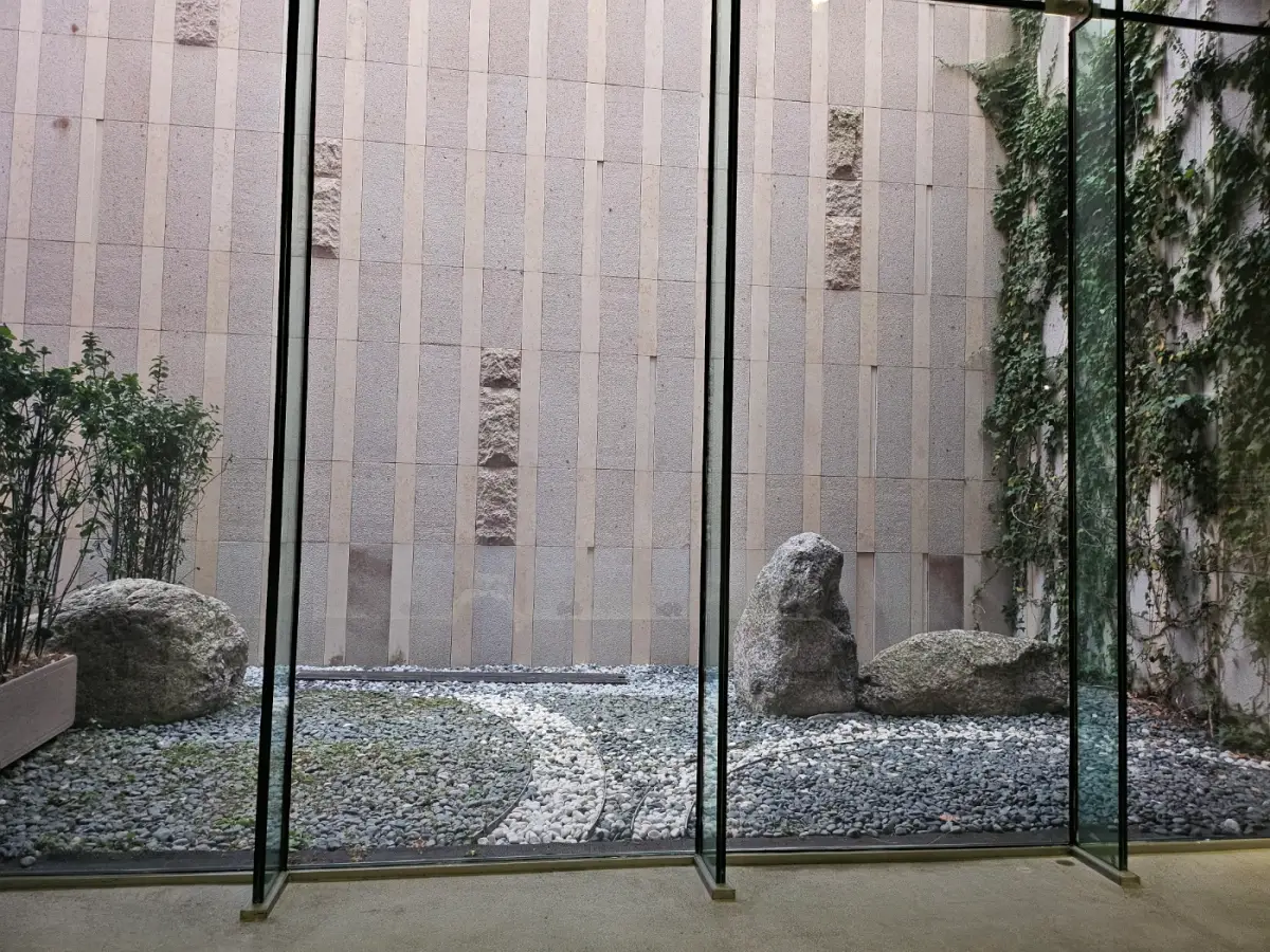 조금더 안쪽으로 들어가자 통유리로 막힌 정원을 앞에두고 헤드폰이 놓여있는 긴 벤치가 있다. 자갈이 깔린 정원은 돌이 우직하게 서있고 간간히 작은 나무가 서있는 식물보다는 돌이 돋보이는 공간이다. 고요히 모습을 바라보다 내면소리가 잦아들때쯤 헤드폰을 쓰면 잔잔한 목소리가 들려온다. 작가들의 목소리가 그자리에서 오랜시간을 보낸 돌이 전하는 역사와 지혜같이 머리에 울려퍼진다. 놓여진 대본을 읽으며 보기보단 그냥 듣기를 권하는데, 눈이 글자를 따라가는 것보다 정원쪽을 보며 헤드셋을 들으니 감각이 청각을 따라 깨어나는 것 같았다. 아 역시 이유가 있구나! 싶었다.