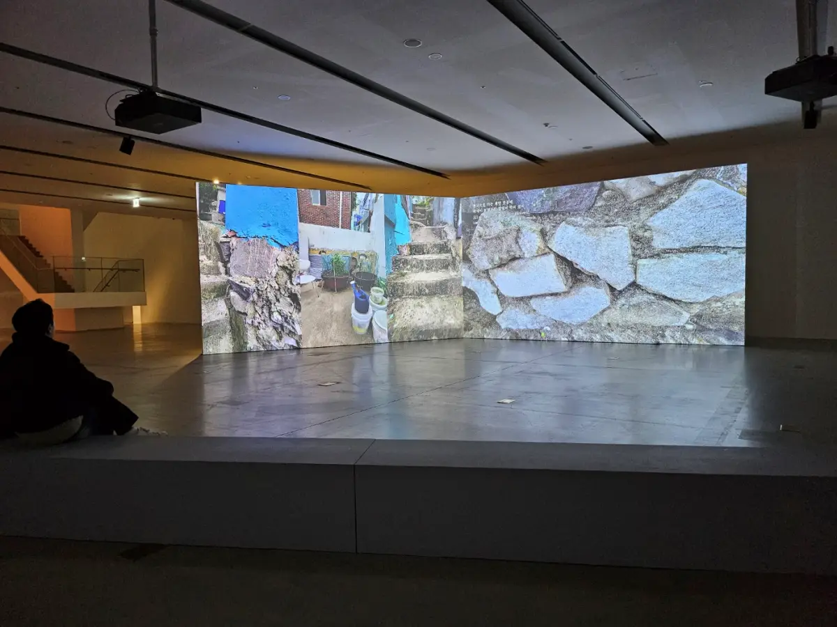 정원을 보다 돌아서 나오니 모니터 두개가 붙어있는 상영물이 나온다. 돌길, 돌계단, 벽돌.. 그 위에서 생을보내는 인간을 흠모하는 돌의 관점을 들여다 볼 수 있다. 인간에게 주변의 돌들은 너무나 당연하기에 돌의 목소리를 듣지 못한다. 둘은 매일 닿아있지만 소통하지 못하고 같은 종족이지만 완전히 닿지못함을 춤으로 표현하기도 한다.