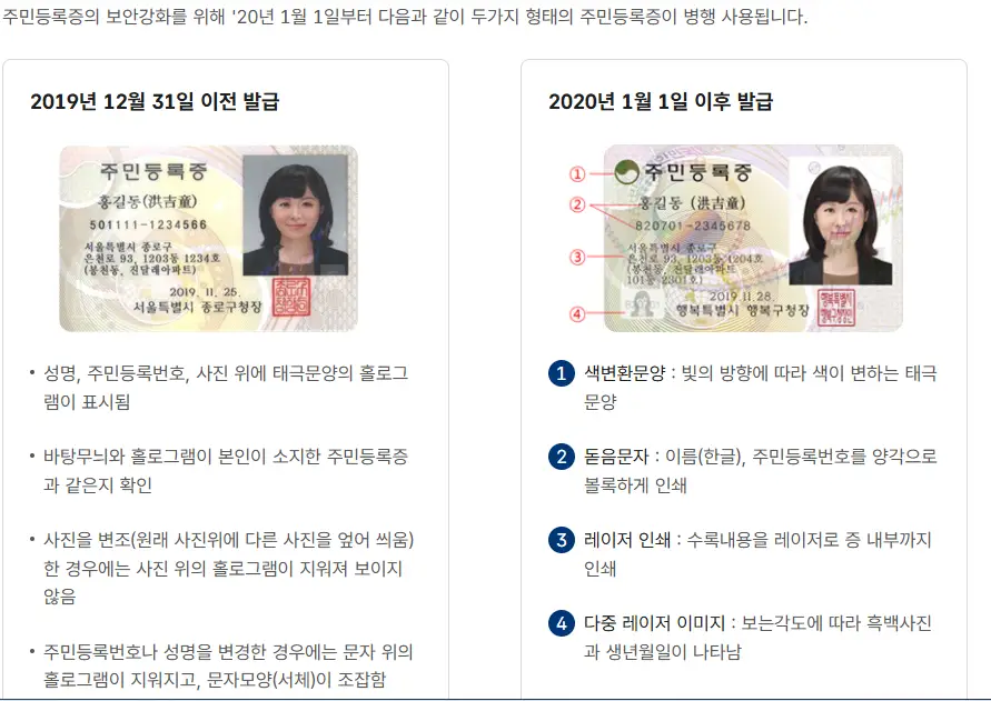 아뿔사. 홈페이지에 들어가니 사진의 위변조여부는 확인할 수 없다고 나와있다. 이 부분에 대해선 앞으로 정부의 대책이 필요할듯싶다. 하지만 위변조 주민등록증의 구분을 도와주는 홀로그램 확인법이 나와있으니 참고하면 도움이 될 듯하다.