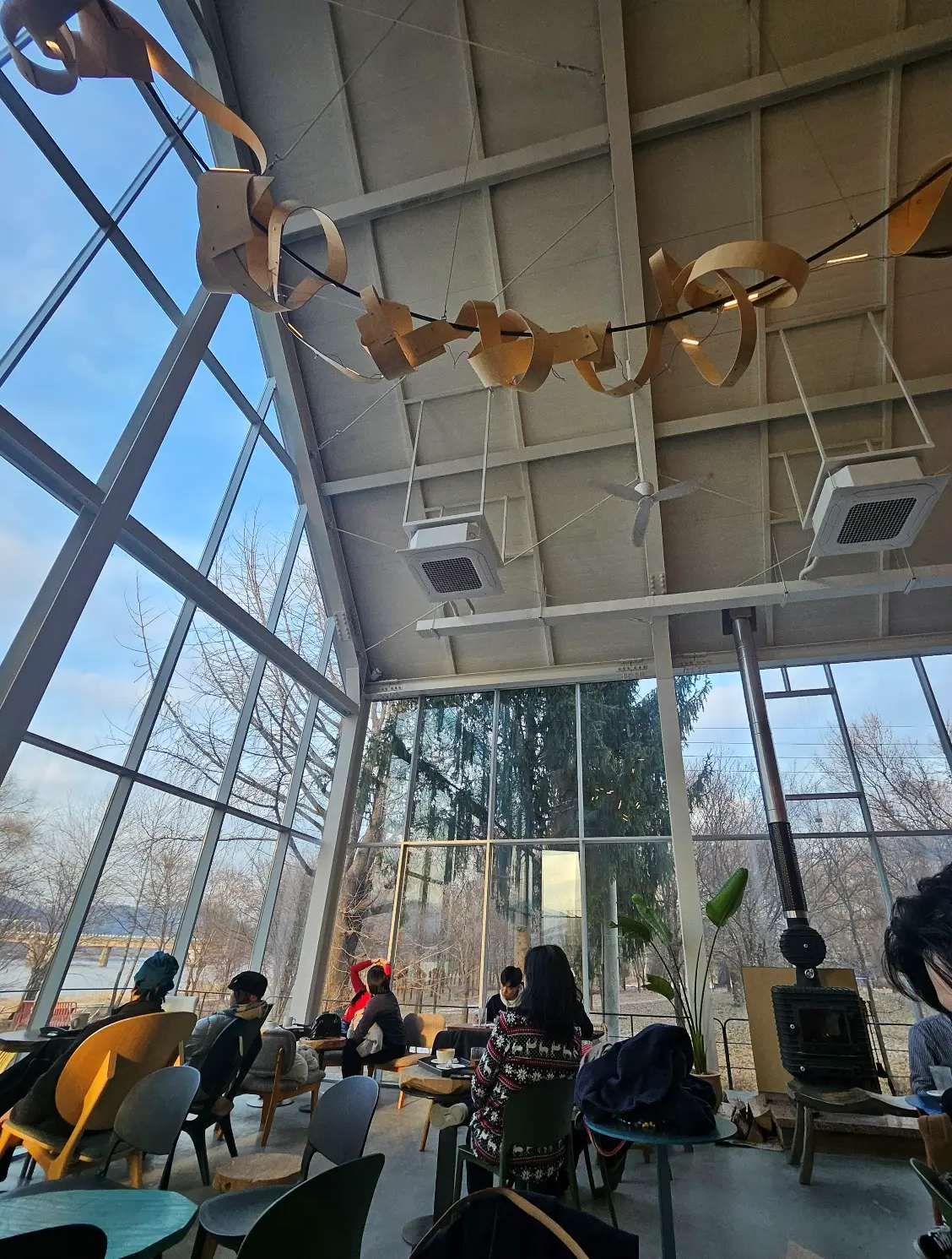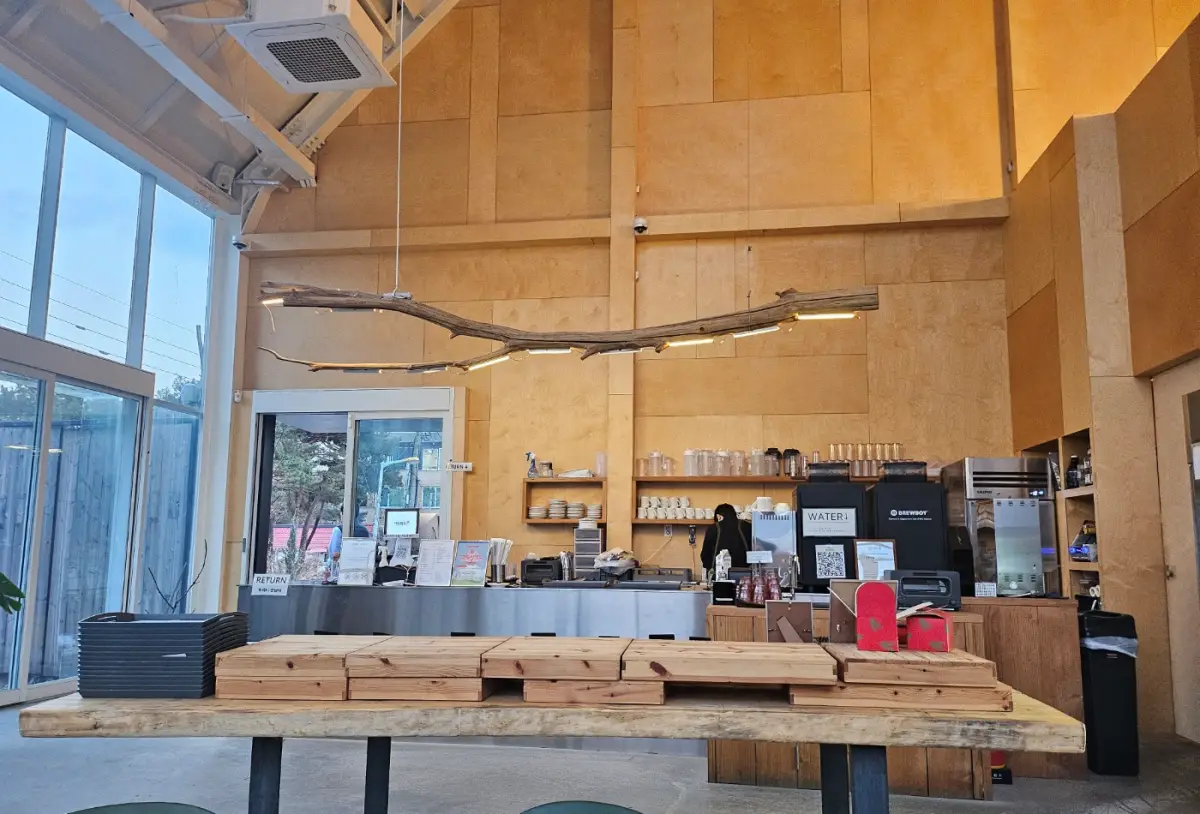 통유리를 통해 자연과 계절의 변화를 감상할 수 있다. 잔잔한 노래가 흘러나오는데 사색에 잠기기 좋은 클래식이나 국악bgm등이 흘러나온다. 높은 천장은 탁트인 자연을 감상할 수 있게 배려한 공간을 만들어진듯하다. 가만히 앉아 흘러가는 윤슬을 쳐다보고 있으면 정화되는 느낌이 든다. 우드 인테리어로 자연 속에 있다는 느낌을 준다.