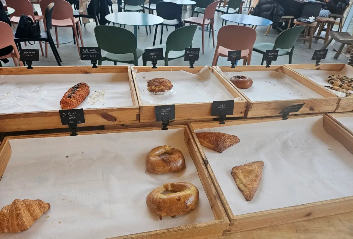카운터와 빵- 빵은 거의 다 나갔다. 뚜껑이 없어서 빵이 마르지 않았나 의구심이 가지만 음료만 2잔 시켜서 알수없다.