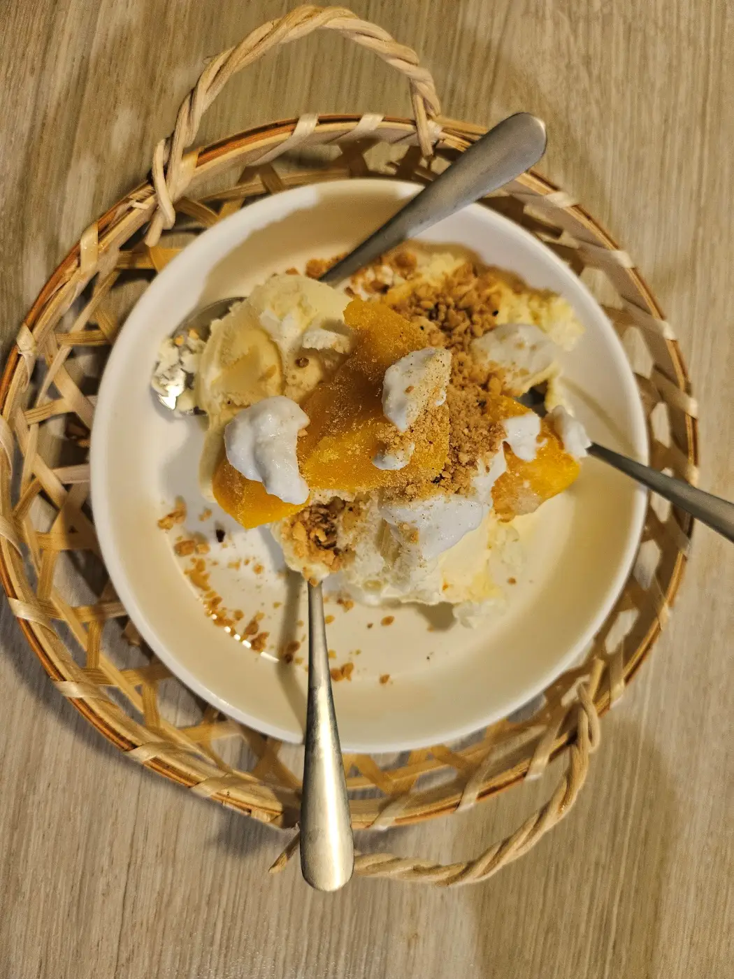 리뷰이벤트 중이라 리뷰를 작성하고 아이스크림 받았다. 땅콩가루, 코코넛, 바닐라아이스크림,망고 재료가 많이들어간 다채로운 아이스크림이었다. 하얀색? 뭔가가 있는데 단단하게 얼어서 떨어지진 않았다. 디저트로 좋았다.
